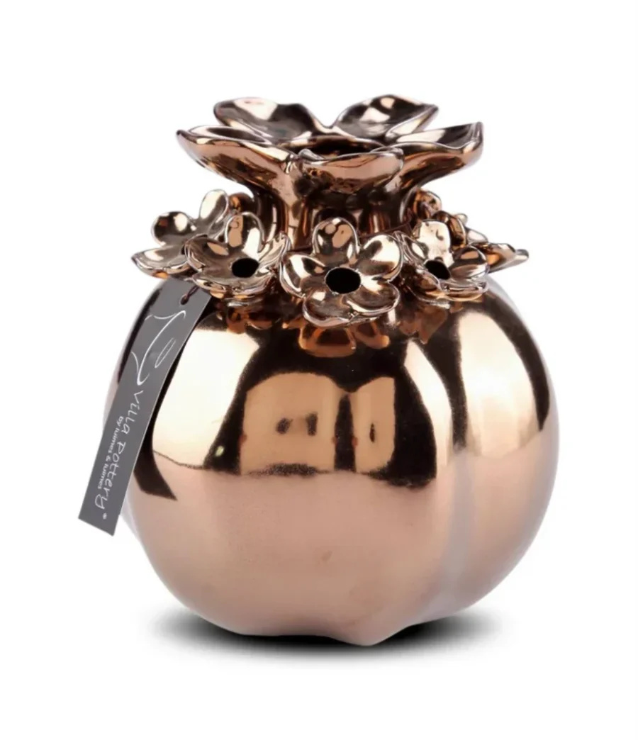 De goud kleurige bloemenvaas Patricia is een bolvormige vaas met meerdere kleine bloemen op de rand welke een speels geheel creëert. De met de hand geproduceerde vaas heeft een tuit vormige opening welke mooi te creëren is met kleine fleurige bloemen. Door zijn natuurlijke lijnen en ronde kraag is de vaas een aanwinst voor elk interieur. Het geeft elke bloem de extra waarde die het verdient. De sierlijke bloemen op de rand geven net dat beetje extra wat het geheel boeiend maakt