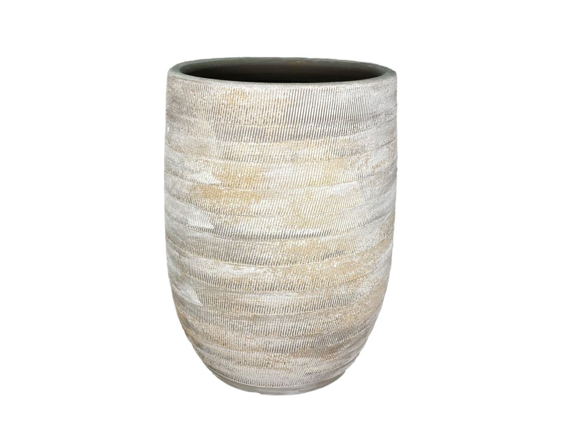 De vaas Miami grijs-beige is een niet alledaagse vaas welke net dat beetje meer geeft aan de ruimte welke het verdient. De ruwe buitenkant van de vaas, met het gewassen cement, geeft met de grijze kleur net die bijzonder eigenzinnige uitstraling voor elke ruimte. De vaas is ook zeer geschikt om als bloempot te gebruiken.