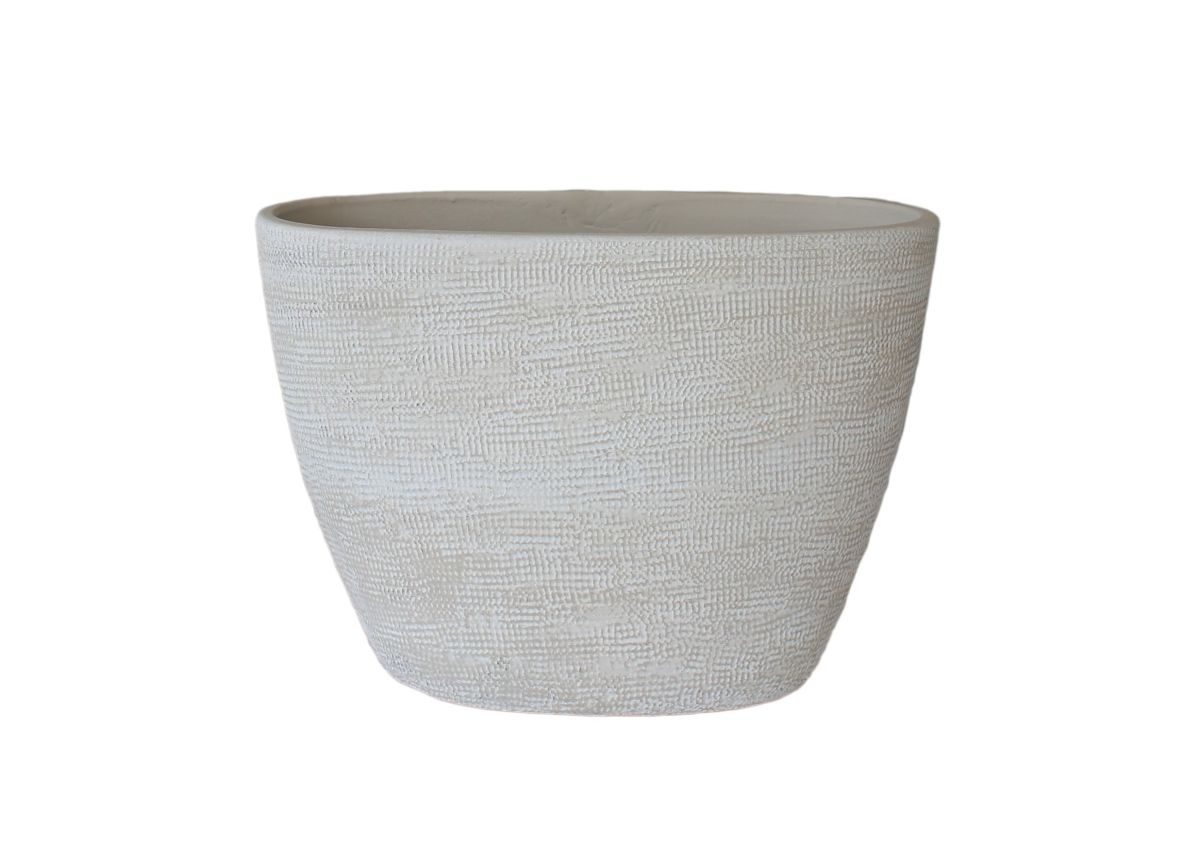 de rustiek creme kleurige potten in de lijn Tokio van HS Potterie zijn stoer en robuust te noemen. De gladde buitenkant met ruw reliëf in de pot hebben een eigenzinnige uitstraling wat weer een heel mooi effect geeft met de kleuren van de pot.