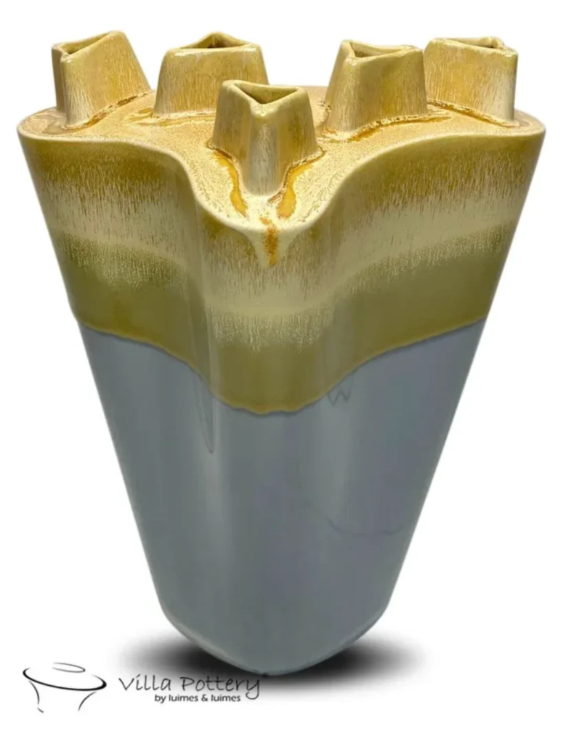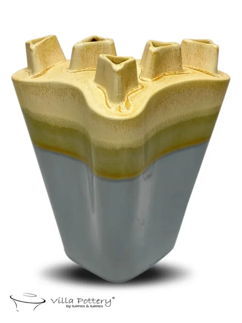 De geel grijs kleurige vazen in de lijn Chimney hebben een strak uiterlijk en valt op door de scherpe lijnen. Wanneer men deze zogenaamde tulpenvaas ziet, weet men waar de naam Chimney vandaan komt. Door de strakke buitenkant met zijn verfijnde kleur is de vaas een echte blikvanger. De kwaliteit van de vaas en de hoge afwerkingsgraad maken de vaas onmisbaar voor elk interieur.