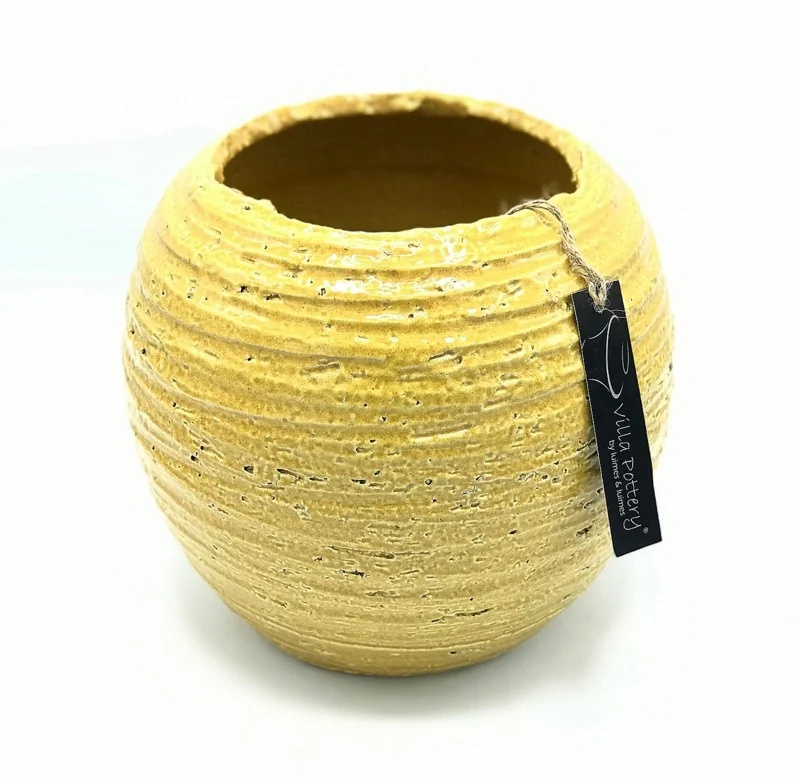 Gele bolpot Stelvio is stoer en robuust te noemen maar zeker ook kunstig. De ruwe buitenkant met ronde opening heeft een eigenzinnige uitstraling wat weer een heel mooi effect geeft met vele verschillende bloemen en planten Lees meer