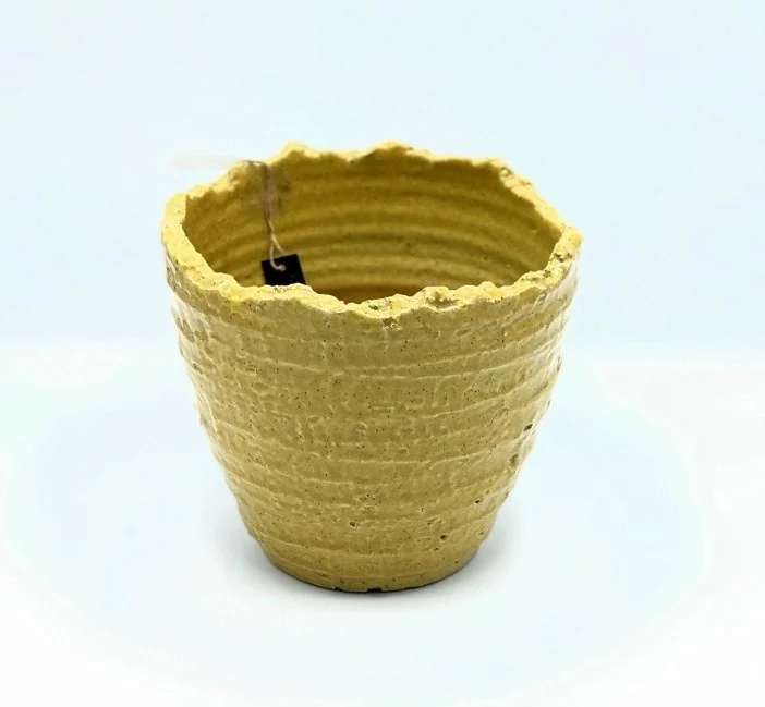 Gele bolpot Stelvio is stoer en robuust te noemen maar zeker ook kunstig. De ruwe buitenkant met ronde opening heeft een eigenzinnige uitstraling wat weer een heel mooi effect geeft met vele verschillende bloemen en planten