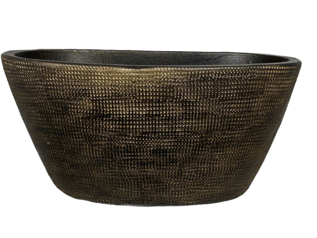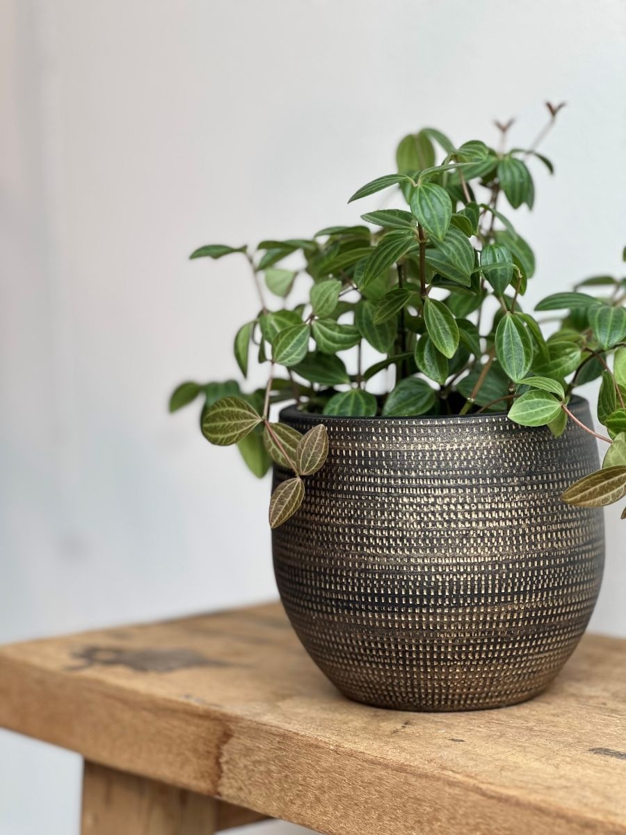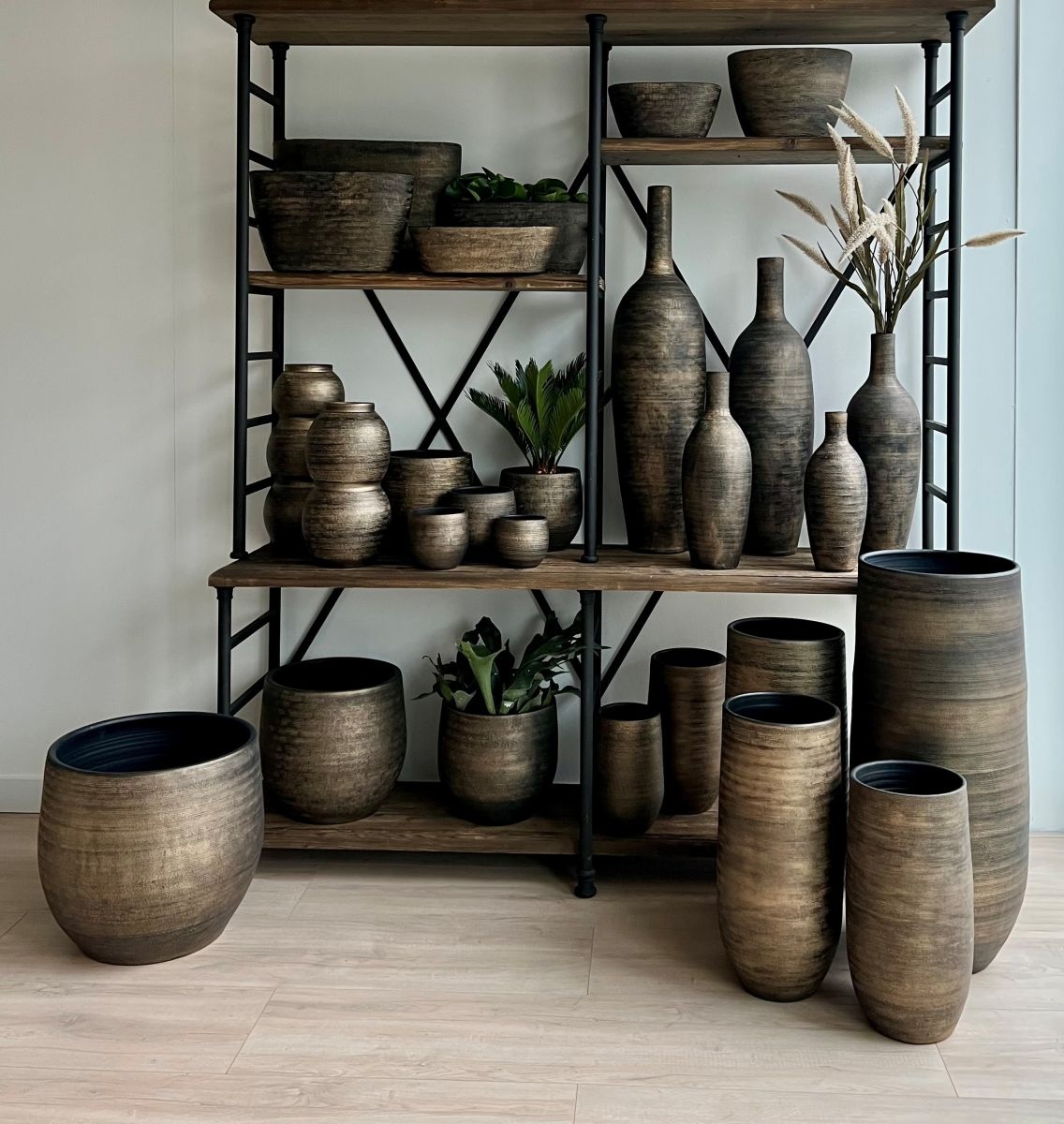 de rustiek goud kleurige potten in de lijn Tokio van HS Potterie zijn stoer en robuust te noemen. De gladde buitenkant met ruw reliëf in de pot hebben een eigenzinnige uitstraling wat weer een heel mooi effect geeft met de kleuren van de pot.