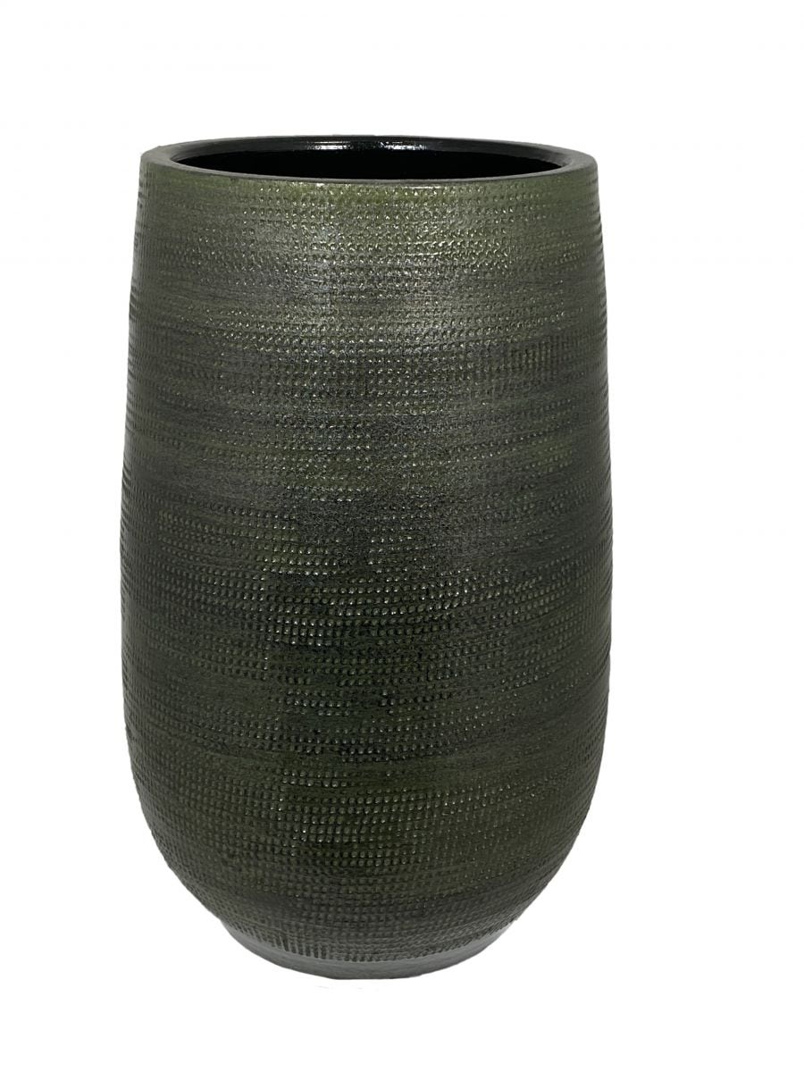 De rustiek groen kleurige vazen in de lijn Tokio van HS Potterie zijn stoer en robuust te noemen. De gladde buitenkant met ruw reliëf in de pot hebben een eigenzinnige uitstraling wat weer een heel mooi effect geeft met de kleuren van de pot. Door de robuuste bouw van de vaas, is de vaas ook goed te gebruiken als pot