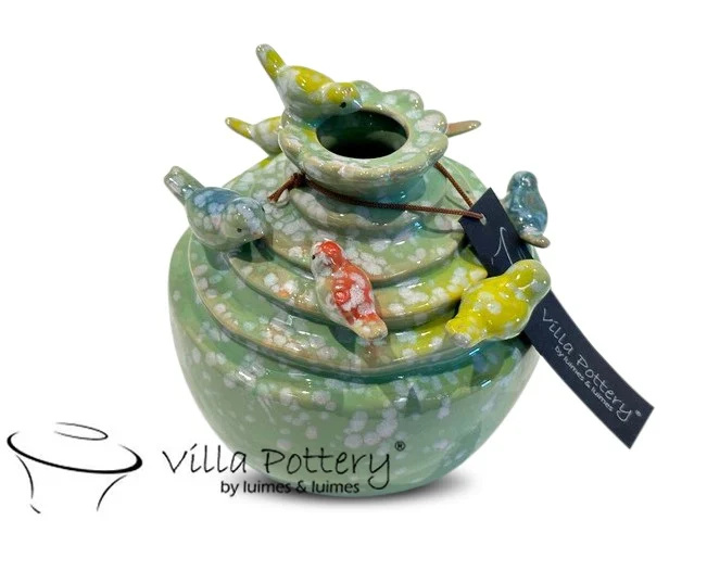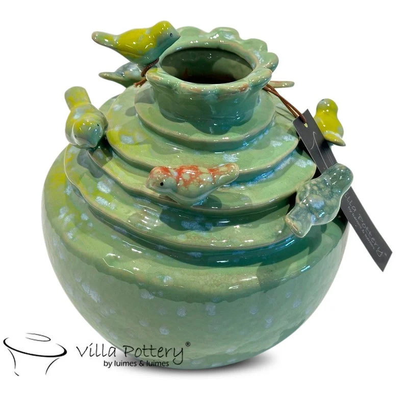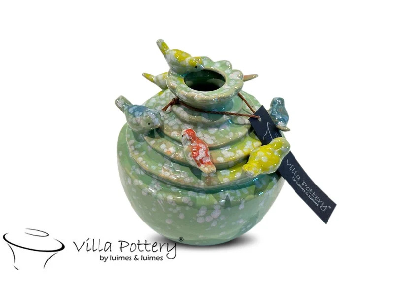 De licht groene vaas Grenada "vogelvaas" is een bolvormige vaas met een kleinere opening met speelse vogels op de rand welke met fleurige bloemen een speels geheel creëerd Door zijn natuurlijke lijnen en ronde kraag is de groene vaas Grenada een aanwinst voor elk interieur. Het geeft elke bloem de extra waarde die het verdient. De speelse vogeltjes op de rand geven net dat beetje extra wat het geheel boeiend maakt
