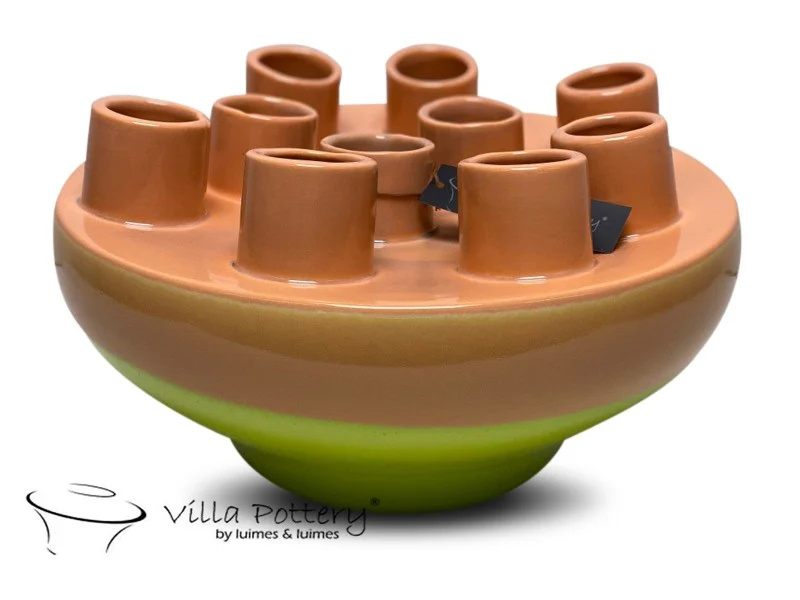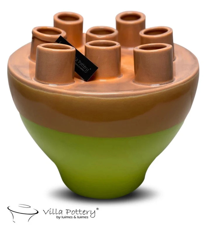 De Jersey potten vallen op door de eigentijdse en speelse manier waarop de kleuren door elkaar heen lopen. Dit samen met de diverse tuitjes die aanwezig zijn voor de verschillende soorten bloemen maken deze pot uniek. De buitenkant laat een mooie overloop zien tussen de diverse kleuren waarmee dit werkelijk een unieke aanvulling is in uw interiuer.