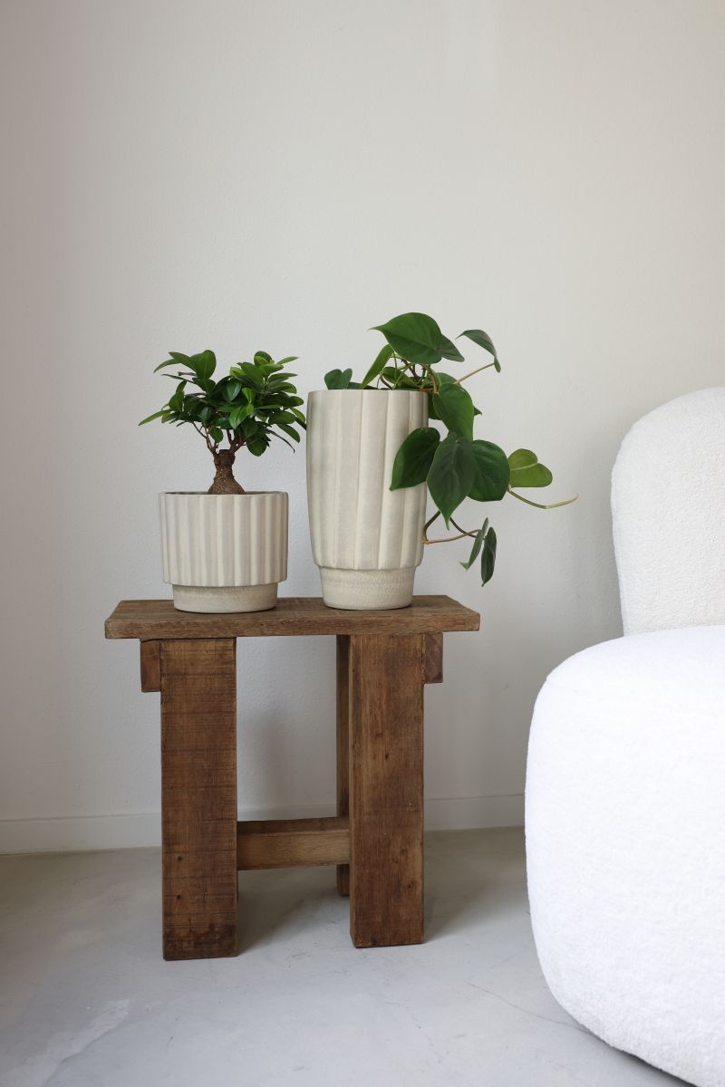 de rustiek beige kleurige potten in de lijn Narvik van HS Potterie zijn stoer en elegant te noemen. De gladde buitenkant met de ribbels in de pot hebben een eigenzinnige uitstraling wat weer een heel mooi effect geeft met de kleuren van de pot.