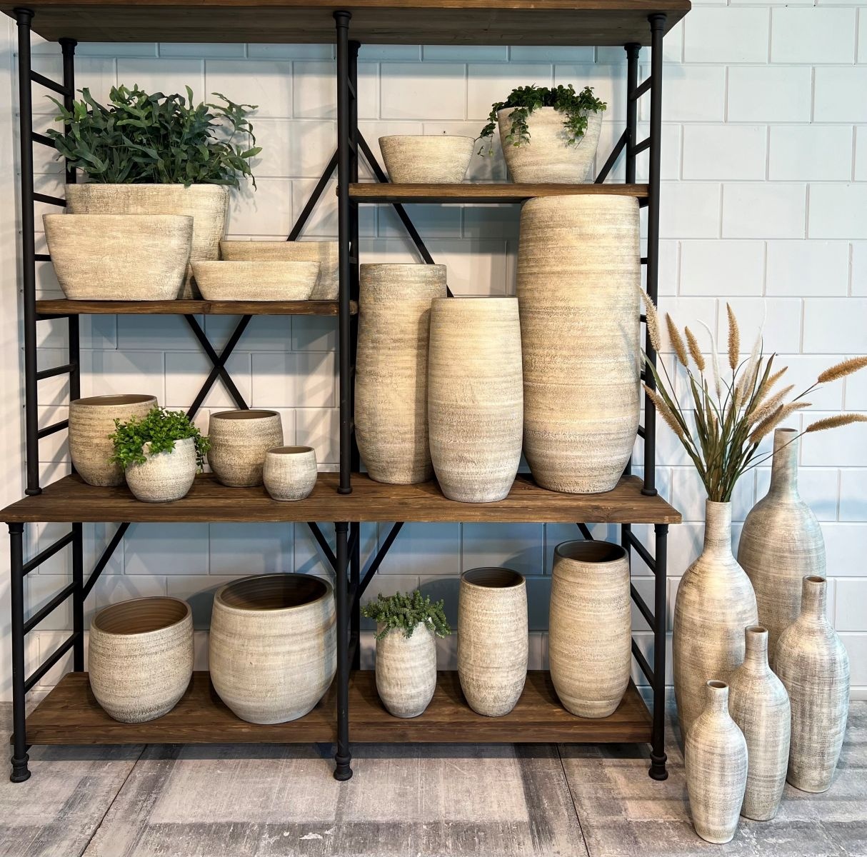de rustiek taupe kleurige potten in de lijn Tokio van HS Potterie zijn stoer en robuust te noemen. De gladde buitenkant met ruw reliëf in de pot hebben een eigenzinnige uitstraling wat weer een heel mooi effect geeft met de kleuren van de pot. Door de robuuste bouw van de vaas, is de vaas ook goed te gebruiken als pot