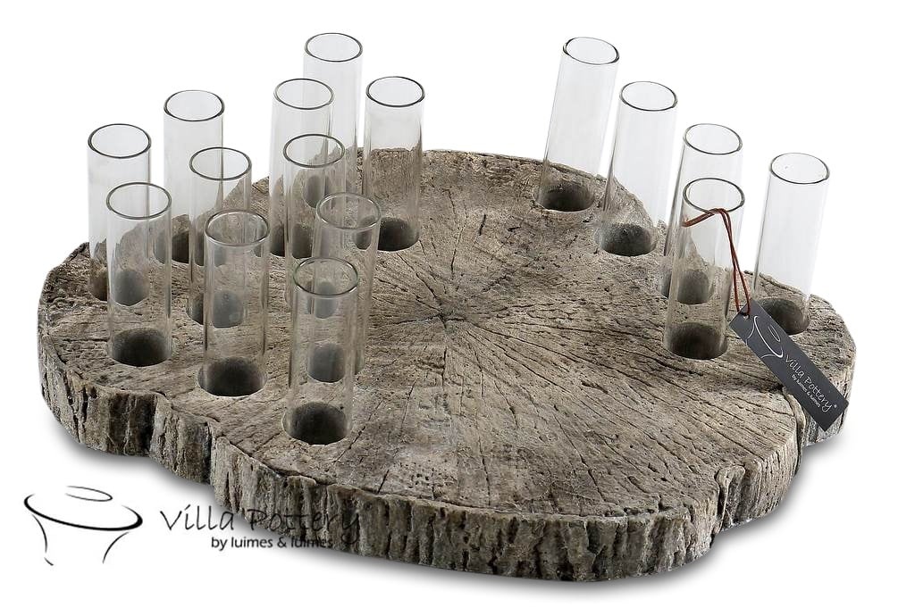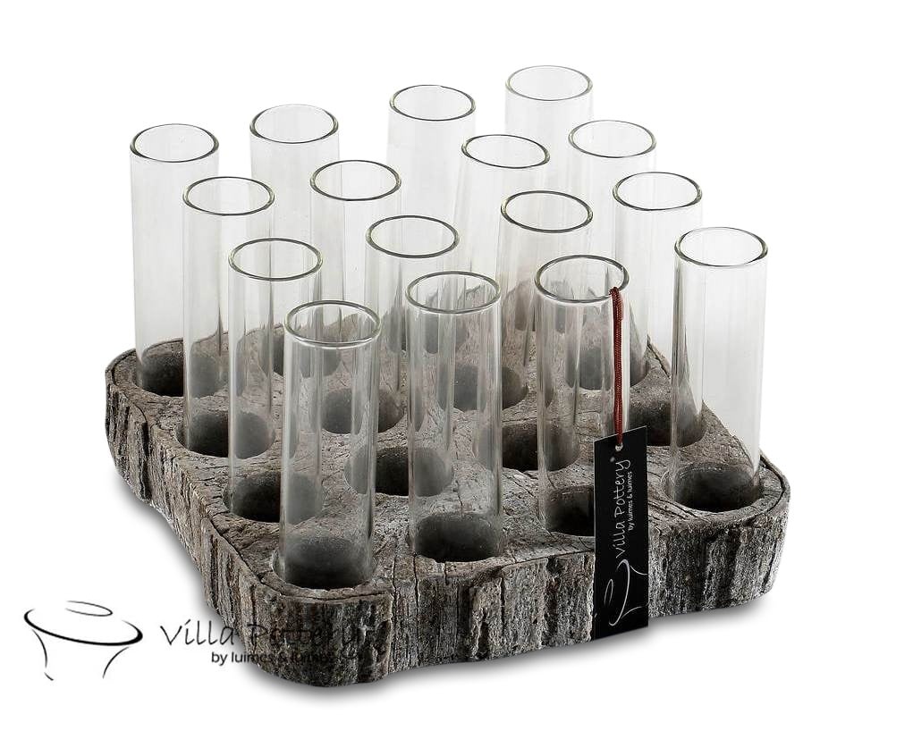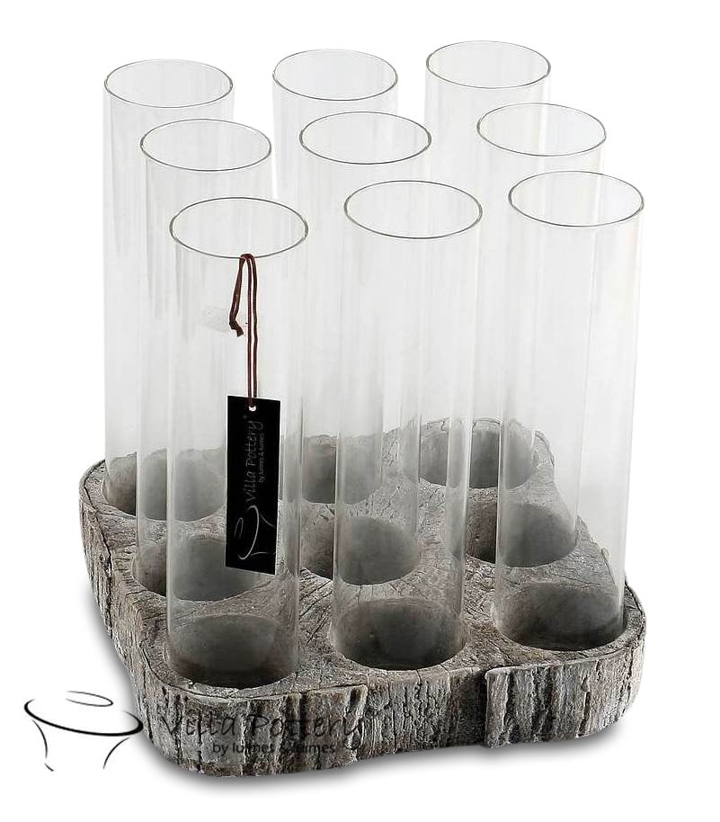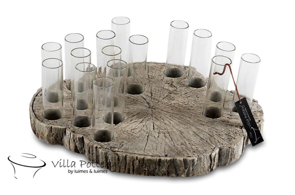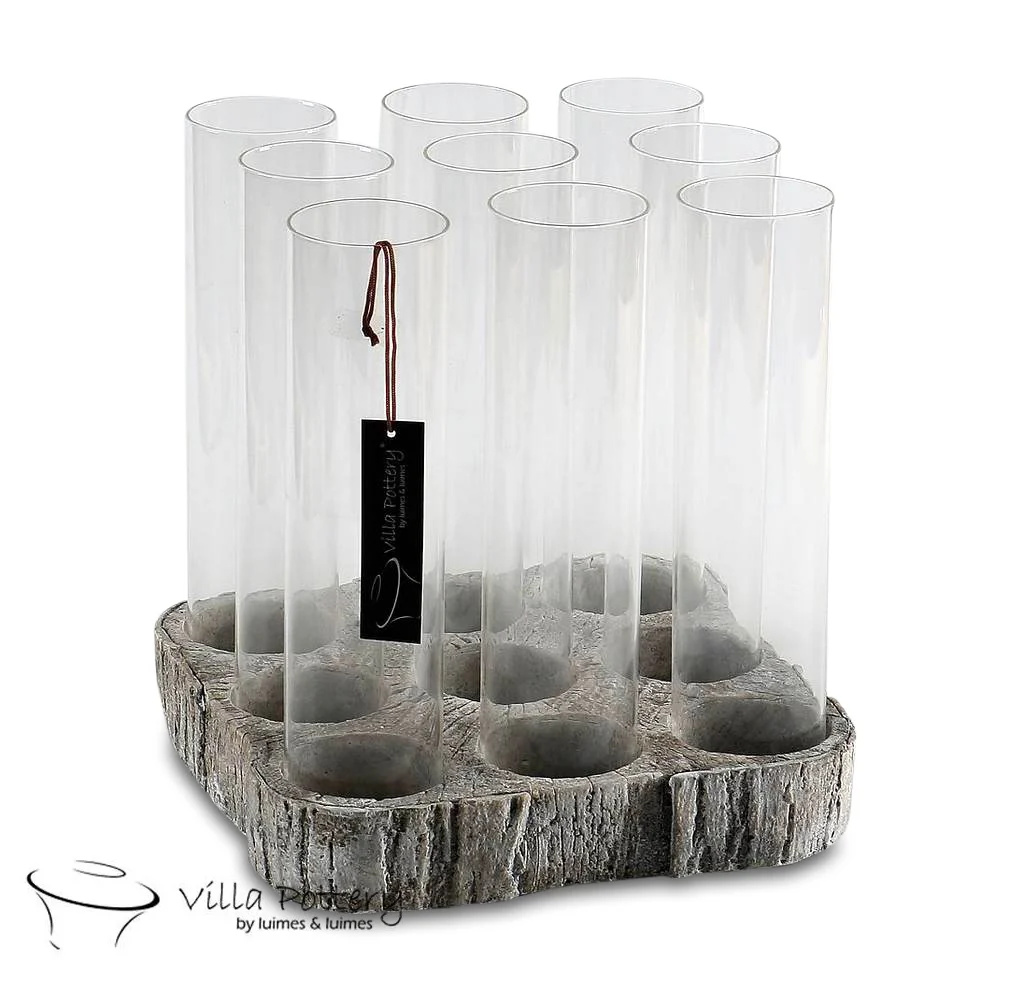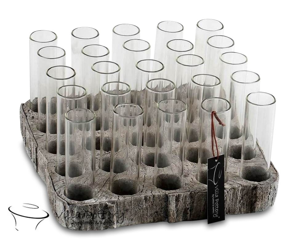 Vaas set Bhutan De Bhutan vaasjes bestaan uit enkele vaasjes tot een plateau van 25 vaasjes met een houten look voet en een glasbuis. Door de houten look en zijn verfijnde bewerkingen zijn de vaasjes een echte blikvanger. Lees meer