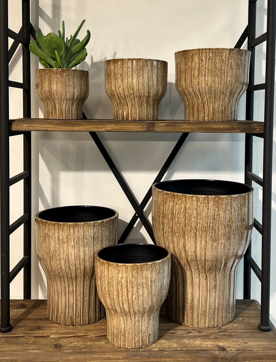 De potten uit de Vigo lijn kenmerken zich niet alleen door de verticale lijnen in reliëf, maar ook de smallere voet. Dit speelse uiterlijk geeft een opvallende indruk in uw interieur.