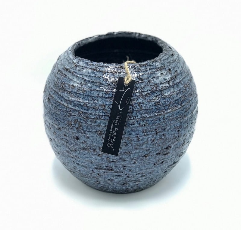 Zwart Blauwe pot Stelvio, de zwart blauwe potten in de lijn Stelvio van Villa Potterie zijn stoer en robuust te noemen. De ruwe buitenkant van de keramische pot heeft een eigenzinnige uitstraling wat weer een heel mooi effect geeft met de kleuren van de Lees meer